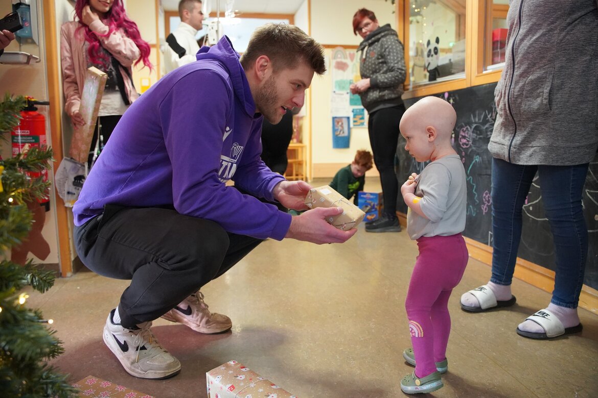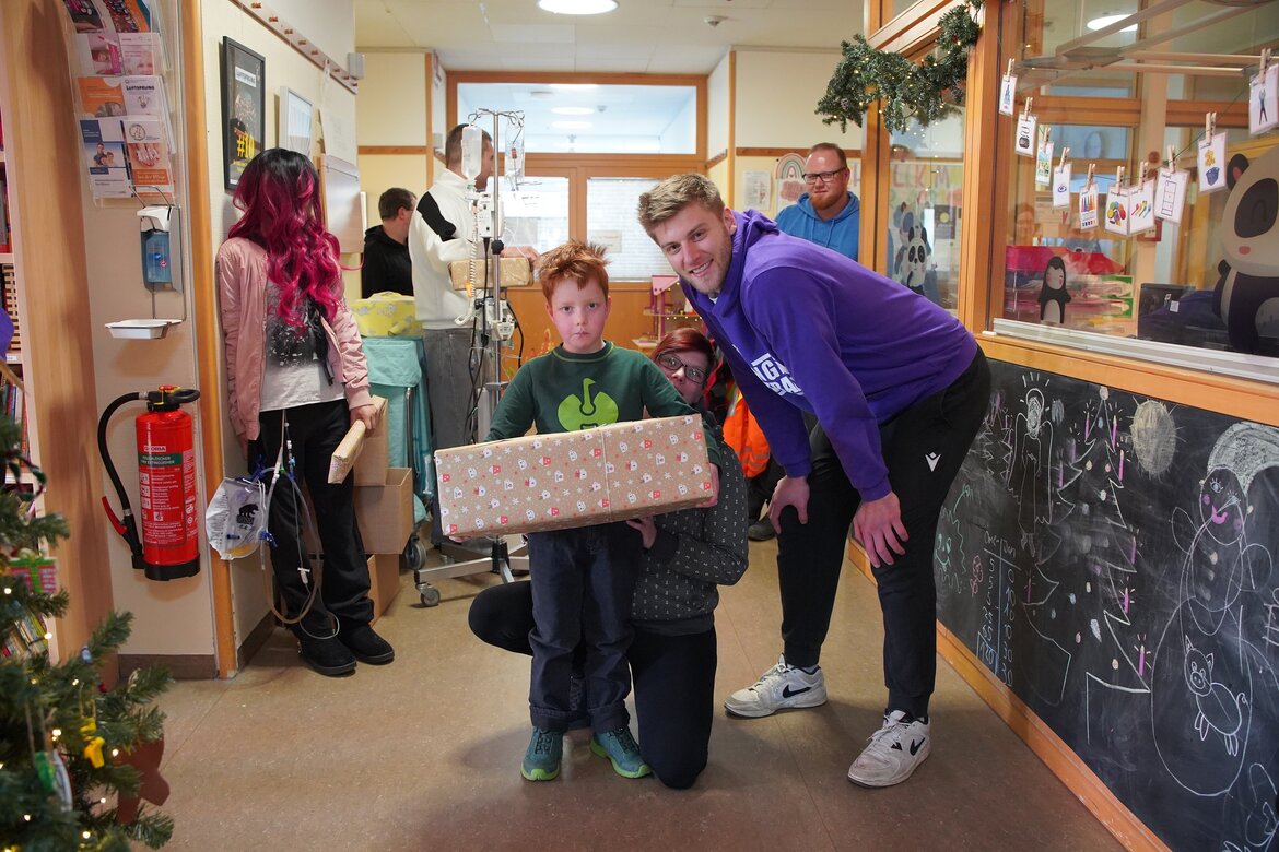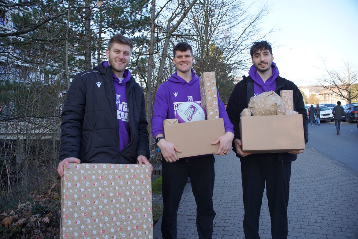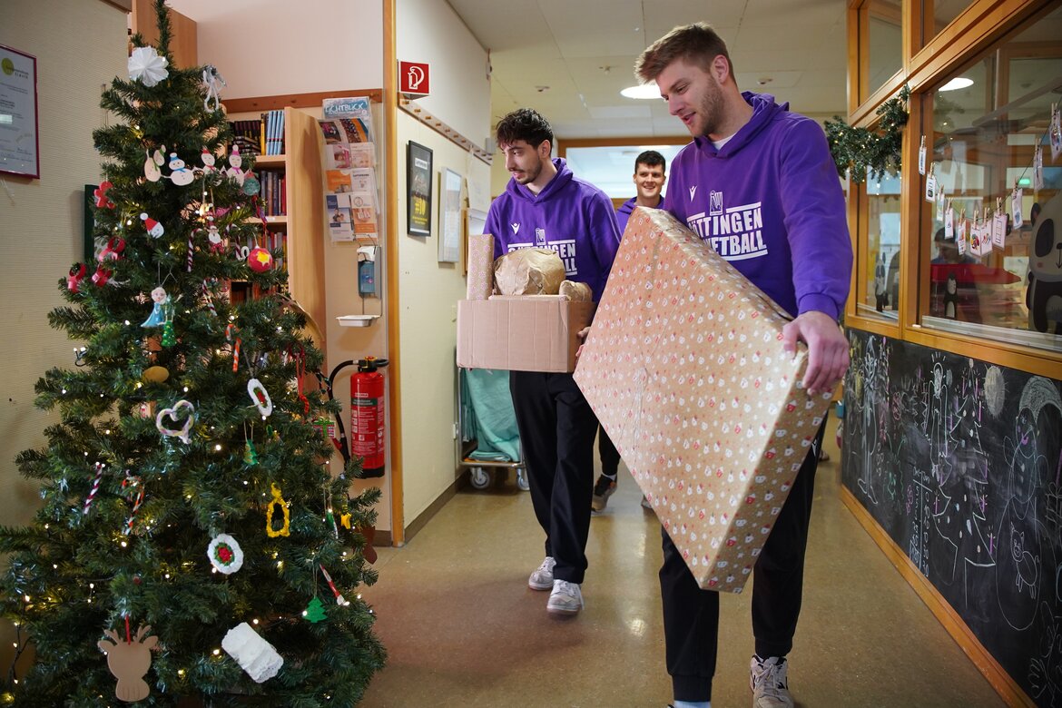 Für die jungen Patient*innen der Kinderkrebsstation der Abteilung Pädiatrische Hämatologie und Onkologie der Klinik für Kinder- und Jugendmedizin der Universitätsmedizin Göttingen (UMG) kam Weihnachten dieses Jahr schon etwas früher: Zusammen mit den beiden Sporttherapeut*innen Kyra Druivenga und Jan Wedig sowie Dr. Christian Baldini, Facharzt der Abteilung Pädiatrische Hämatologie und Onkologie der Klinik für Kinder- und Jugendmedizin, haben BG-Kapitän Mathis Mönninghoff, Julius Böhmer und Kevin Buckingham 26 bunt eingepackte Geschenke an die jungen Patient*innen der Station übergeben.Das gesamte Team der BG Göttingen hatte zuvor Geld gesammelt, um individuelle Wünsche der Kinder und Jugendlichen zu erfüllen.
