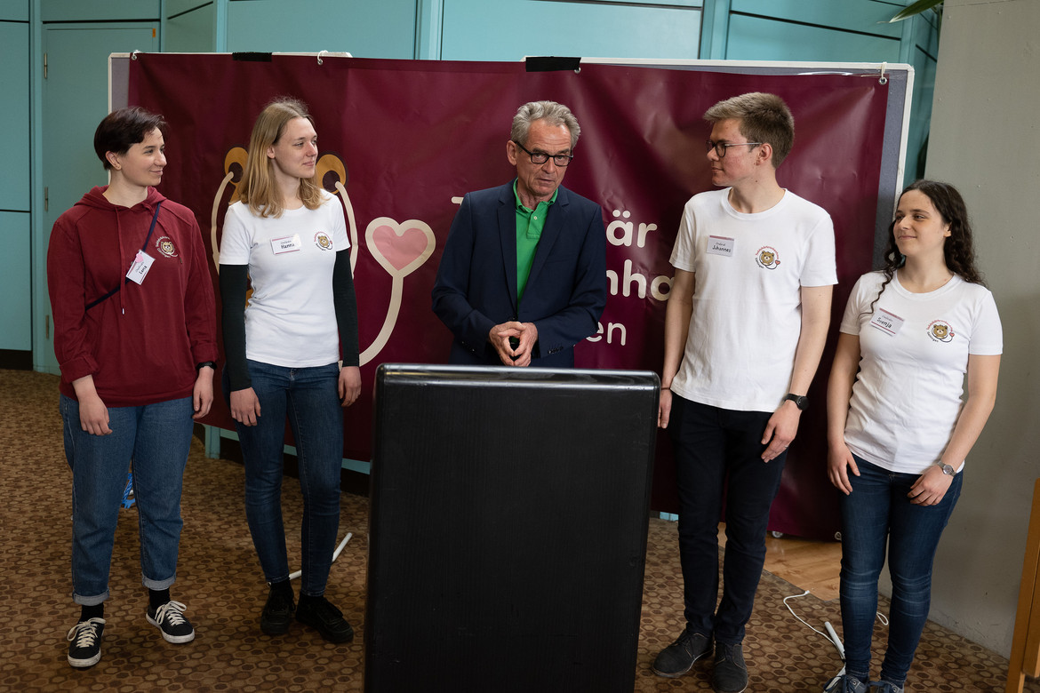 Schirmherr des Teddybär Krankenhauses ist Prof. Dr. Thomas Paul, Direktor der Klinik für Pädiatrische Kardiologie, Intensivmedizin und Neonatologie der UMG. Er kam zur Chefarzt-Visite in die Osthalle. Zusammen mit den Organisator*innen sprach Prof. Paul mit einigen der Kuscheltiereltern im Wartezimmer und den einzelnen Behandlungsstationen. „Das Konzept des Teddybär-Krankenhauses unterstützt uns Kinderärzte herausragend. So spielerisch, wie hier die Abläufe in einer Klinik vorgeführt werden, besser kann man es nicht machen. Die Kinder sind sehr neugierig und interessiert. So haben sie schon mal einen Zugang, wenn sie doch einmal selbst in ein Krankenhaus gehen müssen. Das Engagement unserer Medizinstudierenden bei diesem großen Vorhaben kann man gar nicht genug anerkennen“, sagt Prof. Paul.