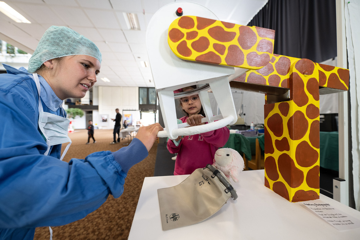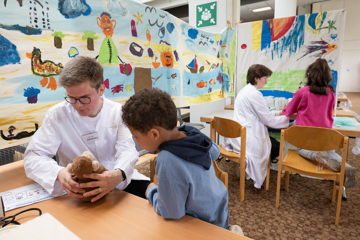 Etwa 40 Medizin- und Zahnmedizinstudierende untersuchten und behandelten an drei Tagen über 900 Plüschtiere, Puppen, Lämmchen und Teddys in allen Farben und Formen. Die kleinen Freunde lagen in den einzelnen Untersuchungsboxen des Teddybär-Krankenhauses in der Osthalle auf den Untersuchungsliegen oder auf dem OP-Tisch. Bei ihrer Anmeldung und dem Anamnesegespräch warteten die Eltern der Kuscheltiere geduldig, bis sie dran waren.